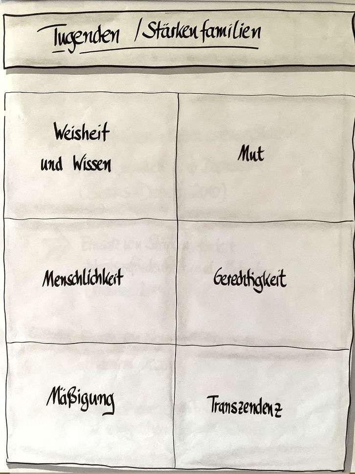 In einem ersten Schritt wurden aus diesen unterschiedlichen Quellen sechs Themenfelder identifiziert, die sich in allen Kulturen wiederfinden lassen. Diese Stärkenfamilien wurden als Tugenden („virtues“) bezeichnet. Die sechs Tugenden sind: